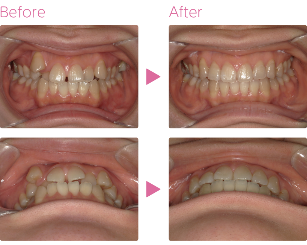 反対咬合と空隙歯列(すきっ歯)を、上下非抜歯で治療した症例です。 見た目と噛み合わせを同時に解消しました。