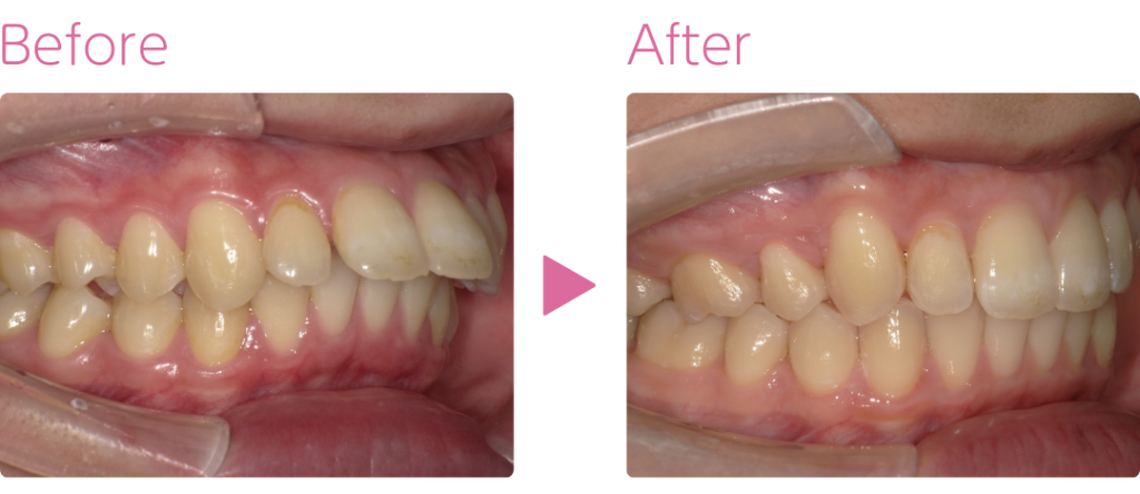 出っ歯を治療するにあたり、上の歯を2本抜歯しました。 マウスピース矯正での抜歯は難易度が高いとされますが、結果として噛み合わせが向上し、口元の印象も大きく改善しています。 あわせて、下の歯を残すことで気道の確保(呼吸への影響)にも配慮しました。治療方針は個人差がありますが、見た目と健康の両立を目指した内容です。